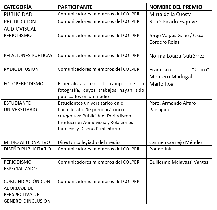 “Este año estamos muy emocionados porque tenemos dos nuevas categorías: periodismo especializado y comunicación con abordaje de perspectiva de género e inclusión. Por lo que invitamos tanto a los agremiados como a los estudiantes de comunicación de las diferentes universidades a postular sus trabajos”, expresó Belisario Solano Solano, presidente de la Junta Directiva del Colper.