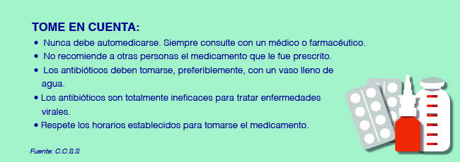 También aseguró que el antibiótico no debe ser suspendido sin autorización médica y, peor aún, si los síntomas han disminuido o desaparecido, ya que las bacterias se vuelven más resistentes y en futuras infecciones ya no serán efectivos. Si el paciente presenta dudas sobre su prescripción, debe consultar con su médico o farmacéutico.