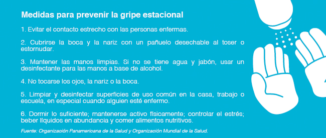 Tome en cuenta que la mejor forma de prevenir la gripe estacional es vacunarse cada año en el momento oportuno. A continuación un recuadro con consejos adicionales.