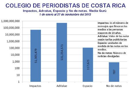 Estudio de Media Gurú del 1 de enero al 27 de noviembre del 2012 reveló que la incidencia de los planteamientos del Colegio de Periodistas de Costa Rica y la presencia de los voceros en medios de comunicación nacionales representó c532 millones de colones equivalentes monetarios de valores en publicidad (ad value).