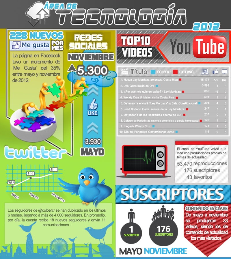 En una medición de las redes sociales del Colegio de Periodistas Facebook, Twitter y el Canal de Youtube tuvo el incremento masivo de seguidores de mayo a noviembre del 2012.