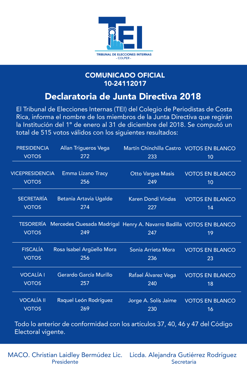 Eduardo A. Bolaños Vargas | Martes 28 de Noviembre, 2017El viernes 24 de noviembre los agremiados al Colegio de Periodistas de Costa Rica eligieron los miembros de la Junta Directiva que regirá la institución en el período del 1 de enero al 31 de diciembre del 2018.