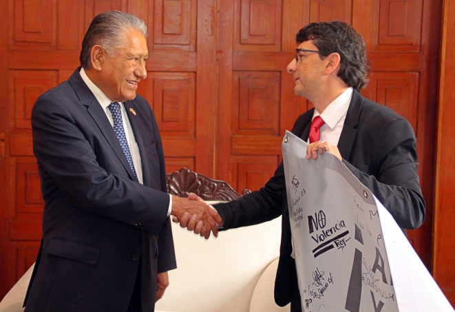 | Viernes 3 de Noviembre, 2017La manta con firmas de profesionales y estudiantes de la comunicación, iniciativa del Colegio de Periodistas, se encuentra ya en manos del embajador mexicano, el señor Melquiades Morales Flores, quien recibió esta muestra de apoyo en el “Día Internacional para poner fin a la inmunidad de los crímenes contra los periodistas”.