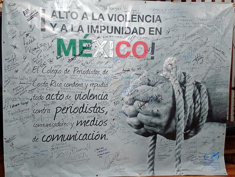 La manta, que se tituló “Alto a la violencia y la impunidad en México”, permaneció durante varias semanas en el las instalaciones del Colper. A partir del 11 de setiembre comenzó una travesía por las universidades costarricenses que brindan la carrera de periodismo, iniciando por la Universidad Federada San Judas Tadeo, luego visitó las instalaciones de la Universidad Internacional de las Américas, en seguida estuvo presente en la Universidad Autónoma de Centro América, concluyendo su periplo en la Universidad de Costa Rica.