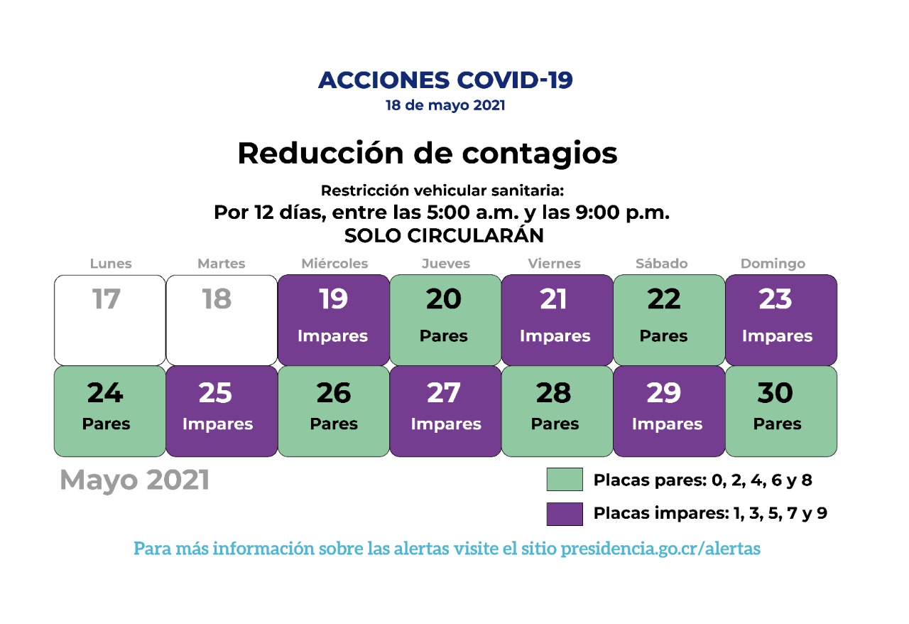 Ante el aumento de casos de contagio por la Covid-19, a partir de hoy rige una nueva modalidad de restricción vehicular, en la cual los vehículos podrán circular únicamente por placas impares y pares, en días alternos, de 5:00 a.m. a 9:00 p.m, así lo anunció en conferencia de prensa el Presidente de la República Carlos Alvarado Quesada.