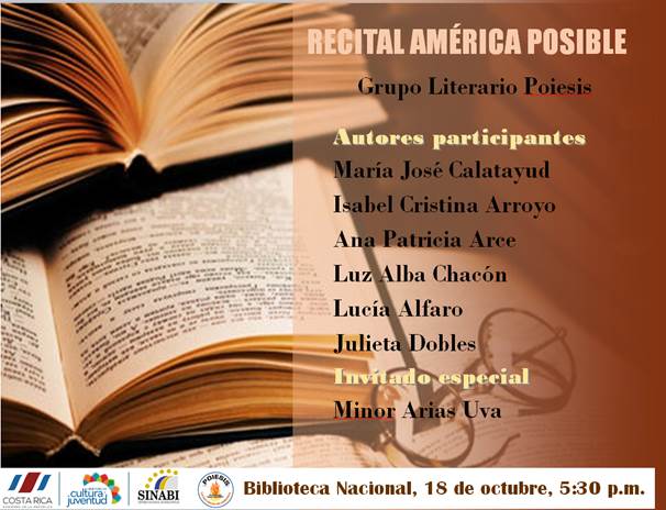 Eduardo A. Bolaños Vargas | Jueves 19 de Octubre, 2017El recital “América Posible”, que se lleva a cabo en la Biblioteca Nacional Miguel Obregón Lizano, reune destacados exponentes de la literatura costarricense, entre el miércoles 18 y el jueves 19 de octubre, con actividades dirigidas para todo el público.