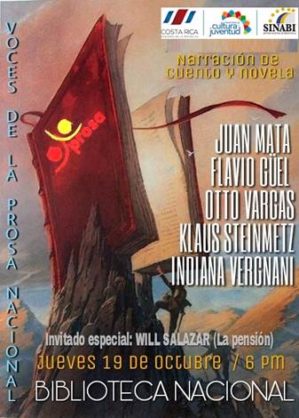 Por su parte, el jueves 19 de octubre se reúnen amantes de la prosa, cuentos y novelas con narraciones a cargo de Juan Mata, Flavio Güell, Otto Vargas, Klaus Steinmetz e Indiana Vergnani; con la presentación de un monólogo a cargo de Will Salazar, actor de “La Pensión”.
