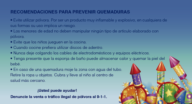 A pesar de que la pólvora no es uno de los factores más frecuentes en accidentes por quemaduras, es importante prevenir a los menores de edad en vísperas de las festividades de fin y principio de año. El Ministerio de Seguridad confirmó que en lo que va del año se han decomisado 7500 unidades de pólvora.