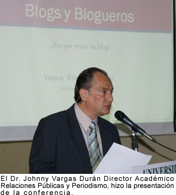 En la conferencia, el Dr. Johnny Vargas Durán, Director Académico Relaciones Públicas y Periodismo, informó que el 73 % de los internautas leen blogs, el 21% los lee diariamente, el 26 % de los usuarios de internet usan la herramienta para opinar de marcas y productos y el 33 % de ellos confían en los criterios emitidos en estos espacios.