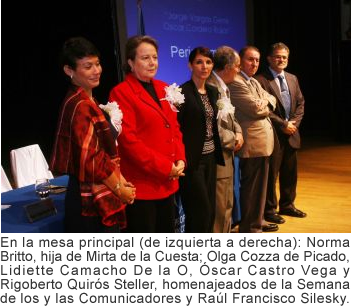 [email protected] El Auditorio Nacional del Museo de Los Niños fue el marco del evento de la entrega de los premios de la Comunicación 2009, del homenaje de la trayectoria de tres destacados periodistas costarricenses: Óscar Castro Vega, Rigoberto Quirós Steller y Carlos Manuel Longhi Carvajal y de la juramentación de 95 nuevos comunicadores que se incorporaron a la institución.El ceremonial mostró la experiencia de la fructífera carrera en comunicación de Ana María Jiménez y Edgar Mata quienes asumieron la conducción de la actividad.