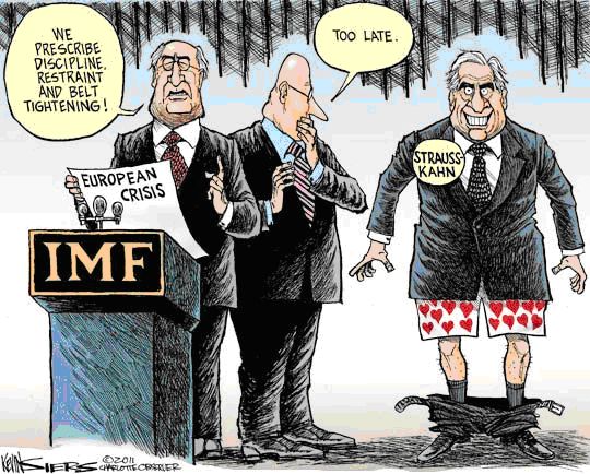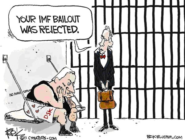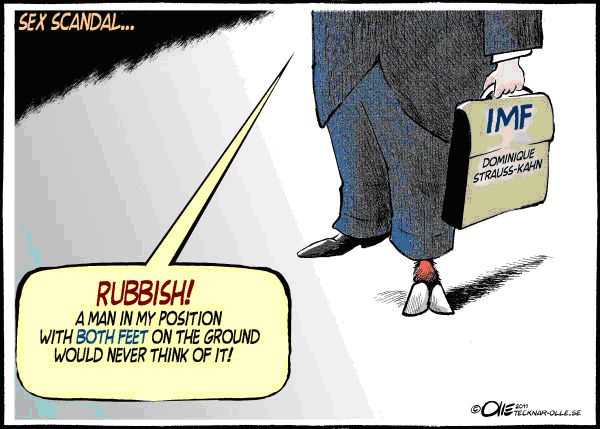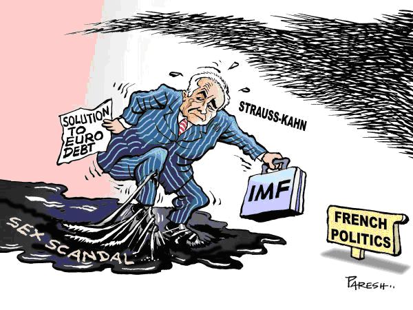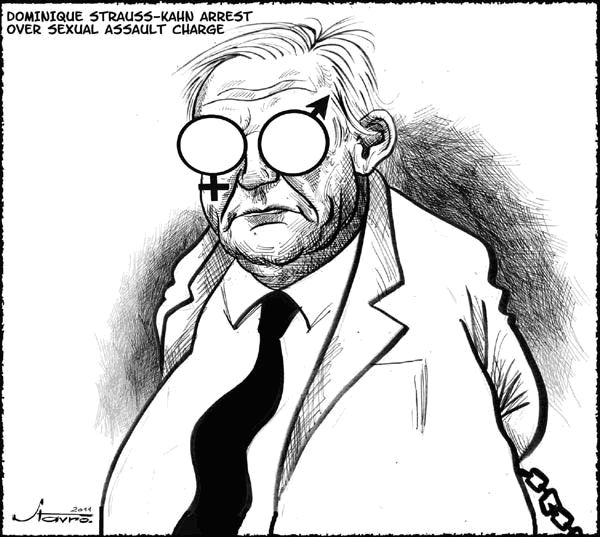 [email protected] El ex director gerente del Fondo Monetario Internacional (FMI), Dominique Strauss-Kahn, quien se perfilaba como el candidato presidencial como podía derrotar al actual mandatario de Francia, se declarará inocente de las acusaciones de crímenes sexuales que le imputa una camarera de un hotel de Nueva York. Este escándalo sexual ha sido el tema de caricaturistas editoriales alrededor del mundo.